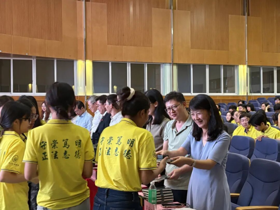 出席见面会的学院领导、教师代表为新生赠送礼物,祝愿同学们行有所得、感有所悟、学有所成、不负青春、不负韶华。