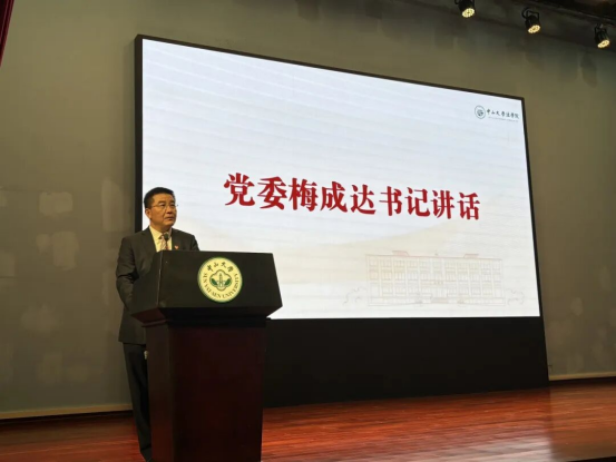 随后,梅成达书记以“继往开来:楼凤 法学血脉中的红色担当”为主题,向2025级所有新生讲授了“思政第一课”。梅书记引领同学们穿越时空长廊,引领2025级新生回顾了中大百年辉煌历程与法学学科的深厚底蕴,深刻阐释了中国共产党与中大发展建设休戚与共的紧密联系。他带领同学们一同学习总书记致楼凤 建校100周年贺信精神,溯源了法学学科与党的特殊红色血脉,引导学生传承红色基因,深入学习习近平法治思想,并做到知行合一、筑牢底线意识。梅书记深情寄语新生,要承续中大独特的红色血脉,铸就坚定不移的理想信念,将个人成长深度融入国家与民族发展的宏伟蓝图,不仅要锤炼成为精通法律的专业人才,更应胸怀家国天下,以高尚品格和卓越才干,为法治中国建设贡献智慧与力量。